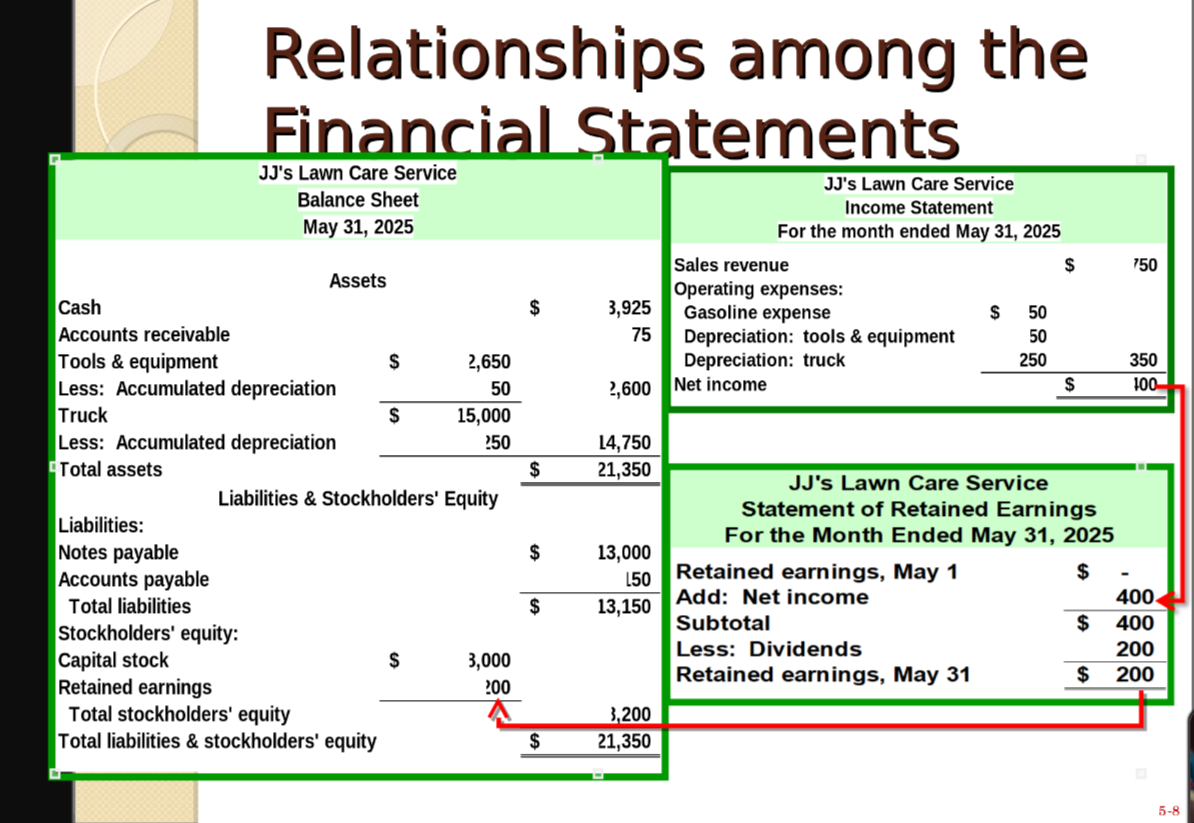 - Owner’s Equity: Amount of an owner’s net investment in a business + profit from operations (e.g., common stock, retained earnings).