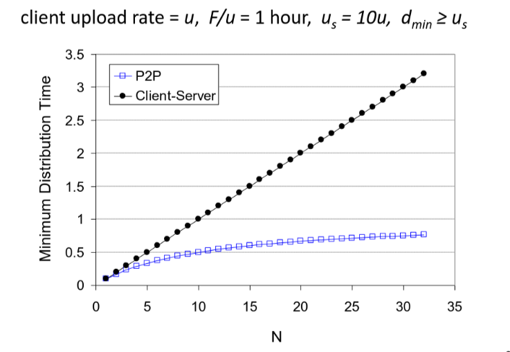 - (Peer Bottleneck): Each peer must download one full copy of the file from the network, so the peer with the slowest download rate () limits the distribution time.