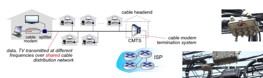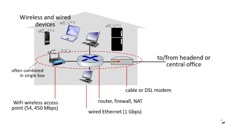 - network of cable, fiber attaches homes to ISP router