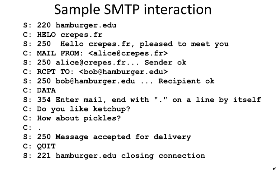 - e.g., HELO, MAIL FROM, RCPT TO, DATA