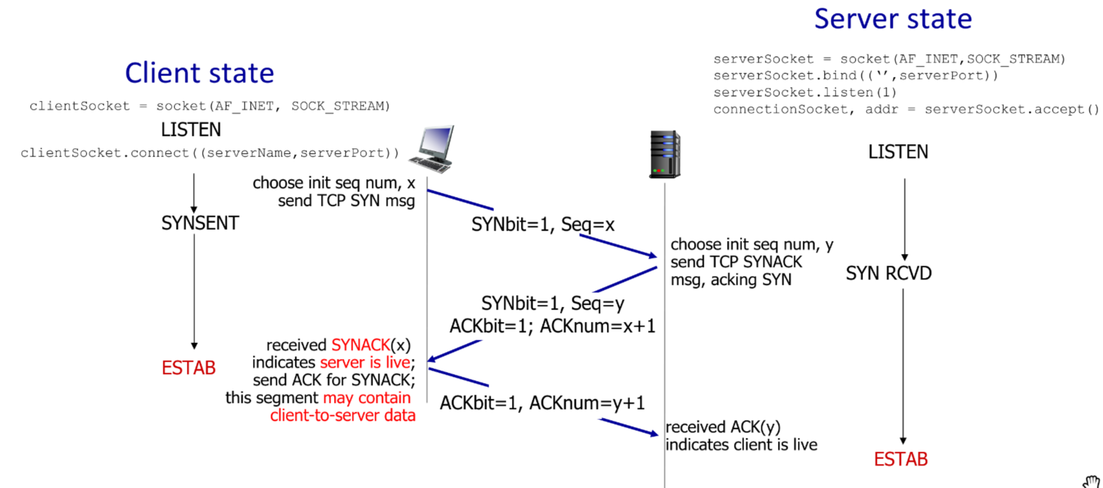 - Initiating client requests a client-to-server: client send SYN