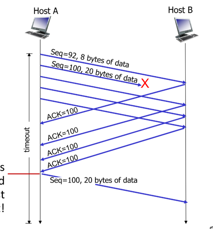 - Sender retransmits a segment if it receives 3 ACKs for the same data (duplicate ACKs)
