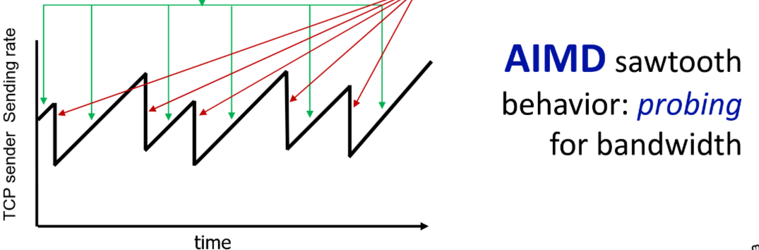 Additive Increase: increase sending rate by 1 maximum segment **Multiplicative Decrease:**cut sending rate in half at each loss event