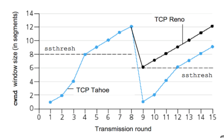 cwndis cut in half window then grows linearly- When loss detected by tiemout (TCP tahoe)