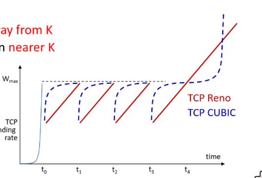 - Concave Growth (Before K): When the current time is far from K, the window increases rapidly to regain lost throughput. As the time approaches K, the increments become smaller and more cautious to avoid overshooting network capacity.