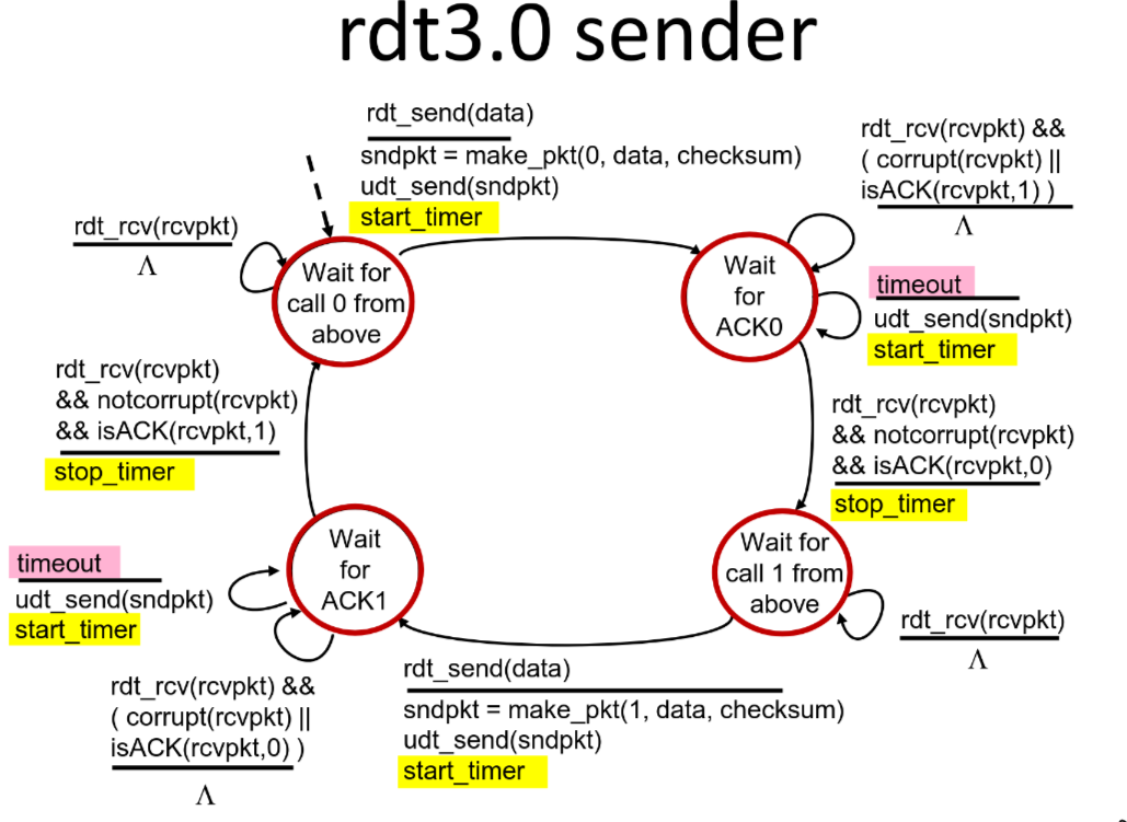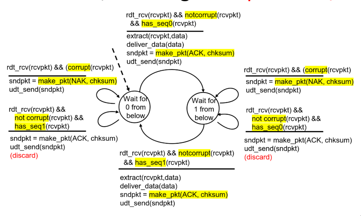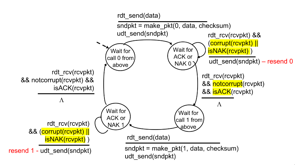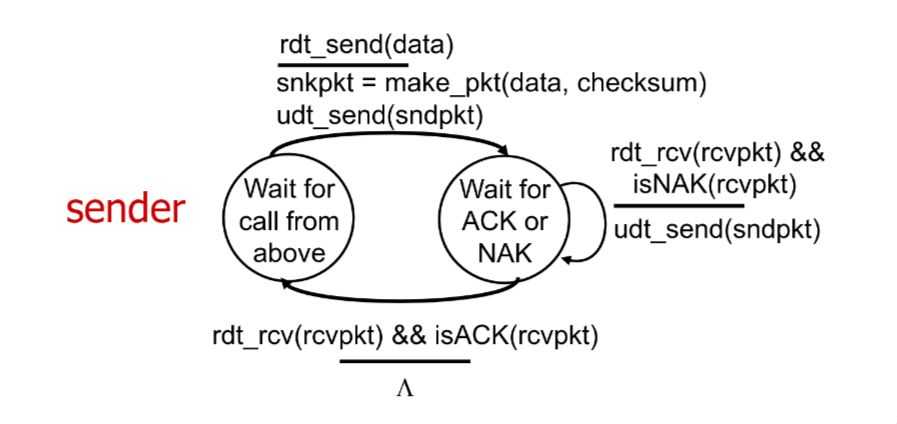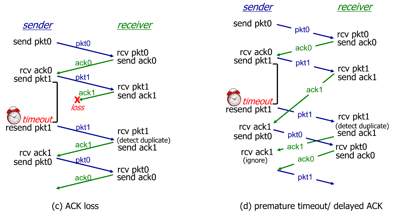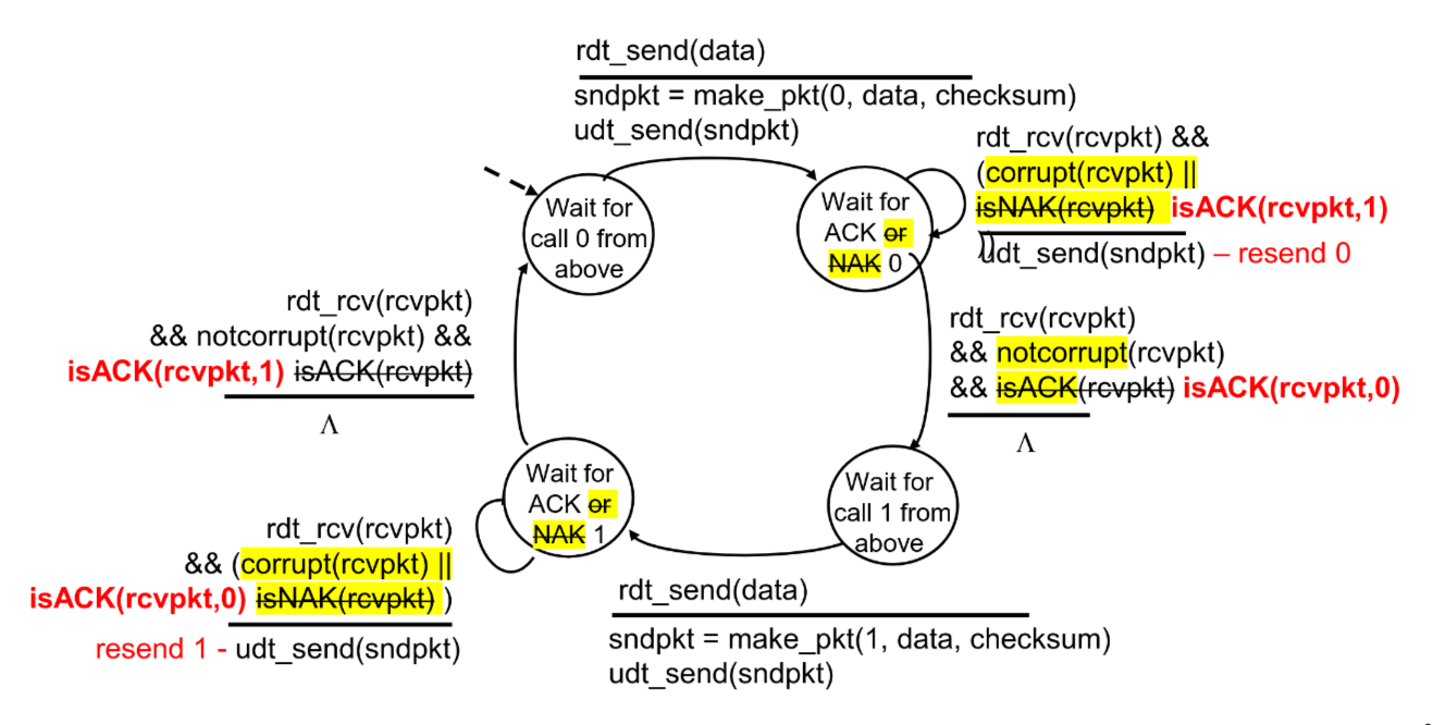 If ACK/NAK corrupted, sender doesn’t know what happened, yet can’t retransmit as it possible duplicate. Fix in rdt2.1