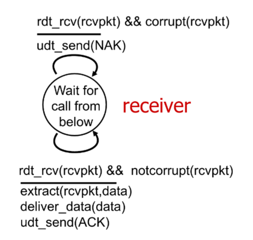 - negative acknowledgements (NACKs): receiver tells sender that packet received with errors, then sender retransmits packet on receipt of NAK.