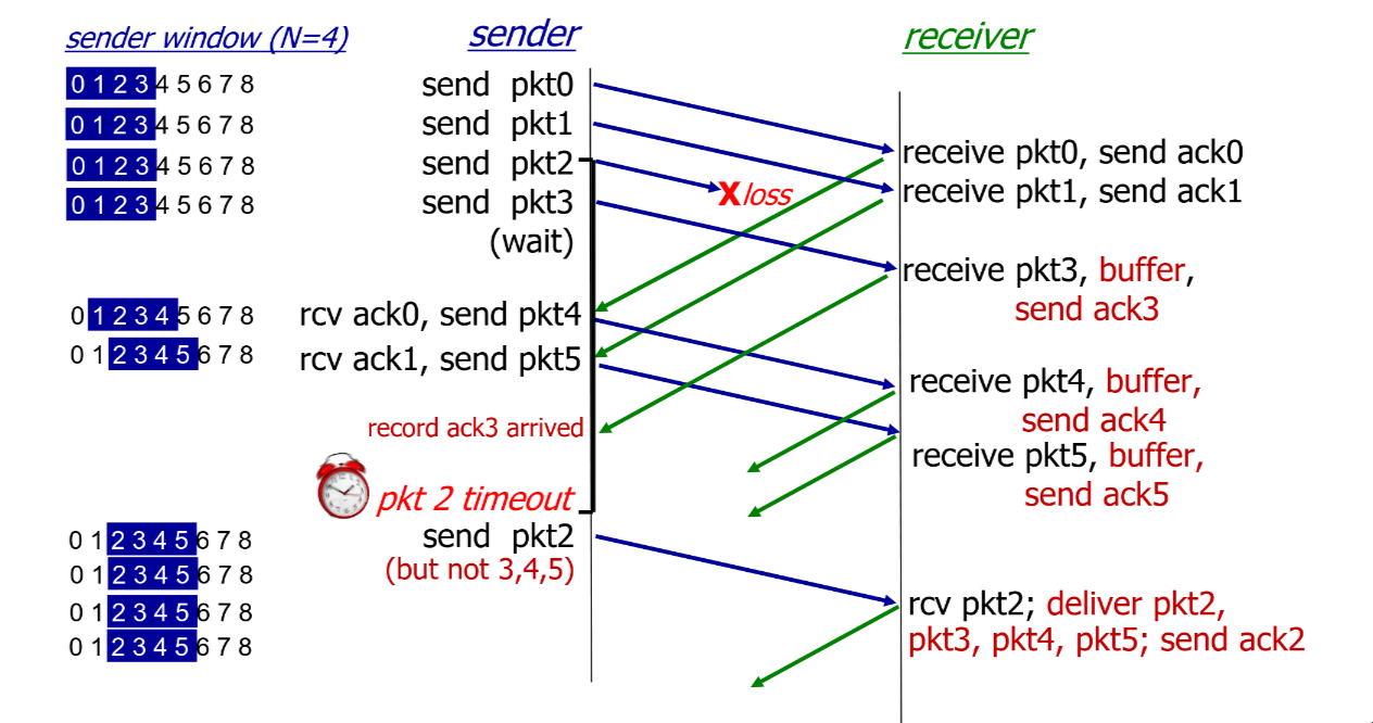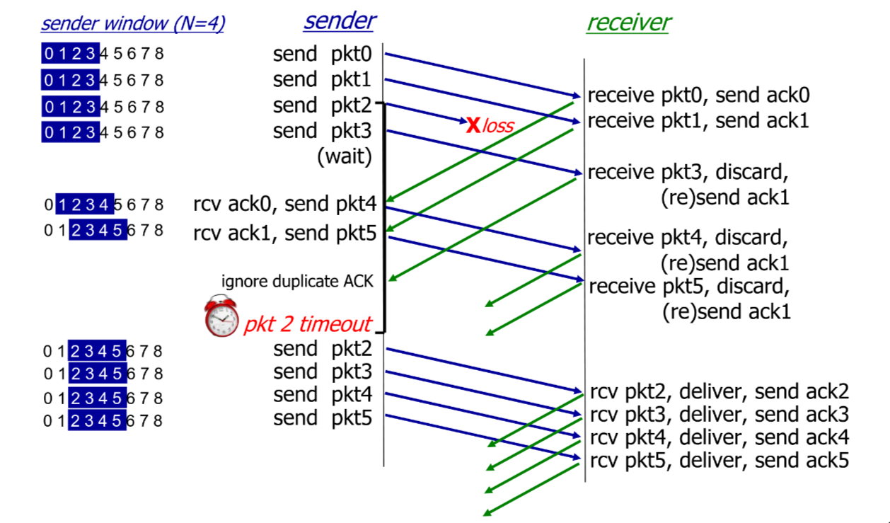- timeout (n): retransmit packet n and all higher sequence number packets in window