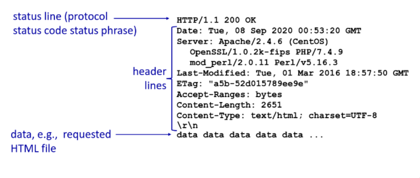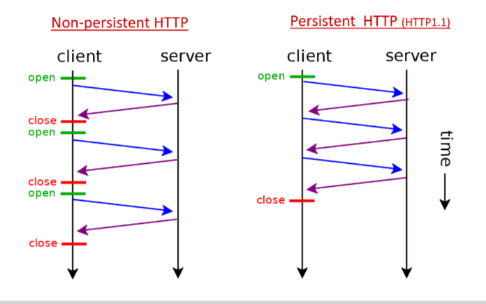 - Persistent HTTP (1.1): Server leaves connection open after sending response. Multiple objects can be sent over a single TCP connection between client and server.