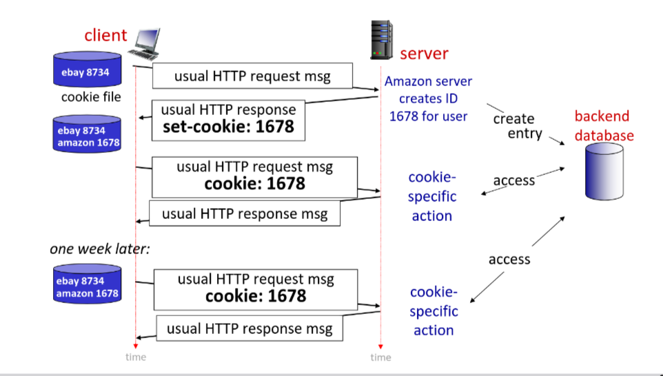 - Cookie file kept on user’s host, managed by user’s browser