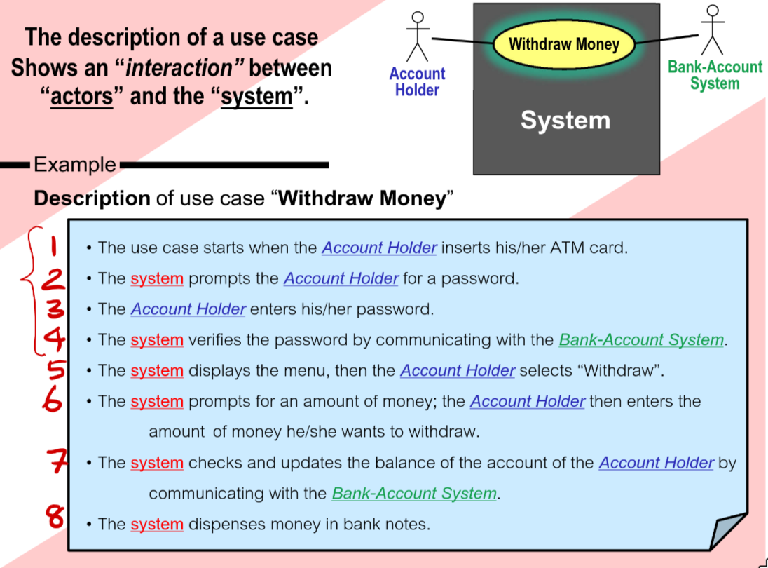 A use case describes what a system does but it doesn’t specify how it does it.